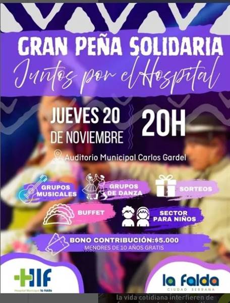 El jueves 20 de noviembre a las 20 h, el Auditorio Municipal Carlos Gardel será el punto de encuentro para disfrutar de una Gran Peña Solidaria, con el objetivo de recaudar fondos destinados a la instalación de paneles solares en el Hospital Municipal de La Falda.